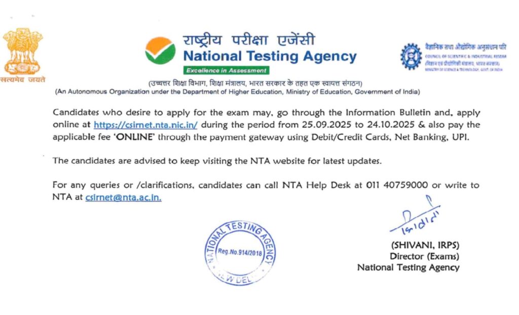 यह खबर शैक्षिक उद्देश्य से तैयार की गई है। इसमें दी गई जानकारी राष्ट्रीय परीक्षा एजेंसी (NTA) की आधिकारिक वेबसाइट और नोटिफिकेशन पर आधारित है। उम्मीदवारों को सलाह दी जाती है कि किसी भी प्रकार के आवेदन या निर्णय से पहले आधिकारिक वेबसाइट csirnet.nta.nic.in पर जाकर पूरी डिटेल अवश्य पढ़ लें।
