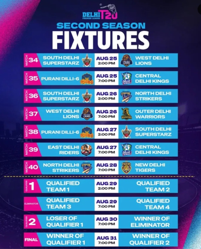 Delhi Premier League (DPL) 2026 के मैच संभावित रूप से जुलाई–अगस्त 2026 के बीच आयोजित किए जा सकते हैं। हर साल की तरह इस बार भी टूर्नामेंट का आयोजन DDCA (दिल्ली जिला क्रिकेट संघ) द्वारा किया जाएगा। आधिकारिक शेड्यूल टूर्नामेंट से कुछ हफ्ते पहले घोषित होता है।DPL 2026 का उद्देश्य दिल्ली के युवा और घरेलू खिलाड़ियों को बड़ा मंच देना है, ताकि वे अपनी प्रतिभा दिखा सकें। क्रिकेट प्रेमियों के लिए यह लीग रोमांचक मुकाबलों और नए सितारों को देखने का शानदार अवसर होगी। सभी अपडेट के लिए आधिकारिक घोषणा पर नजर बनाए रखना जरूरी है।